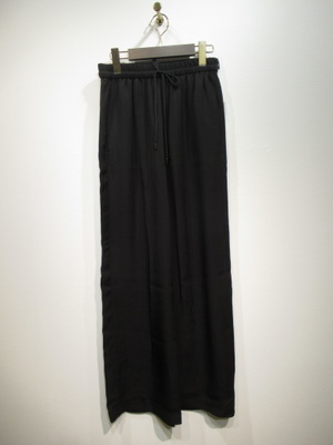 ID:119204とセットになります、ウェストギャザーゴム+紐調整のワイドパンツ、脇ポケット、裏地なし、アセテート生地でやや光沢感あり、シワ感もあります、落ち感あり、手洗い可能