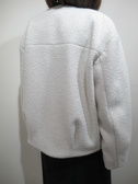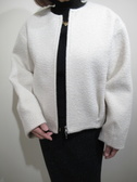 コクーンシルエットの襟なしブルゾン型コート、フロントシルバーファスナー、ダブルジップ、裏地付き、ドロップショルダーで袖口もコクーン、手洗い可能