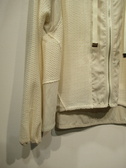 全体に鍵編み、前立てと裾脇から裾にかけて・袖付け部分は同色異素材の生地、ファスナーシルバー、フード襟の紐はグログラン、袖口ゴム入り、裾が後ろ長め、手洗い可能