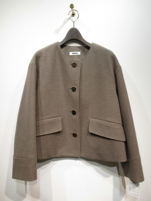 襟なしショート丈コート、ドロップショルダー、大きなボタンが特徴、裏地あり