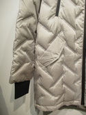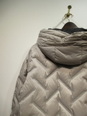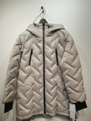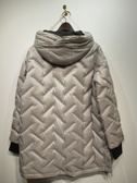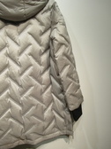 ヒップが隠れるミディアム丈のコート、フード襟(紐調整可)、正面ファスナー、両脇にファスナーでスリット入りにもできます