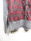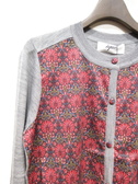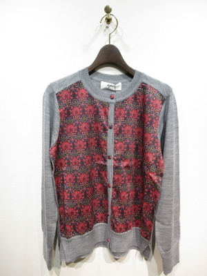 前身頃はリバティプリント 後ろ身頃はウール無地の配色 クルーネックのカーデ 脇スリット リバティプリントの生地でボタンはくるんでます