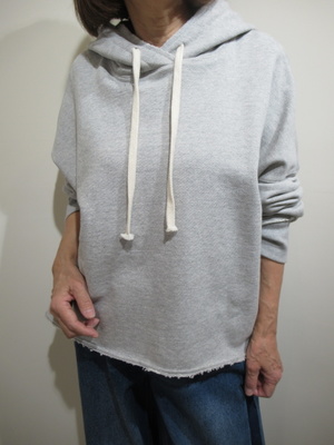 スウェット生地 ドロップショルダーなので身幅が広めになります プルオーバーのフード襟 裾は前上がり 始末は切りっぱなし(ほつれ止めのミシンがかかってます)袖口カフス ライトグレーは杢です 手洗い可能