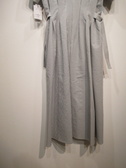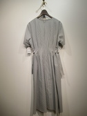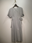 細めのストライプ、中央に(フロントバックともに)タック入りで立体的に、縦の切り替え、ウェストには両サイドにベルトデザイン、首元浅めのVスリット、裏地無し、手洗い可能、後ろファスナー