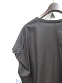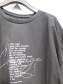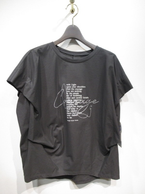 英字プリントのロゴ、フレンチスリーブのカットソー、脇にワンタックが入りブラウジングのようなボリュームを出しています、裾前後差あり、手洗い可能