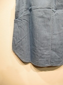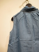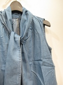 ダンガリーデニム地のノースリーブ、ボウタイブラウス、ボウタイは身頃につながってます、ネックの後ろギャザー、フロントスキッパー襟、裾ラウンド、手洗い可能