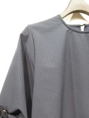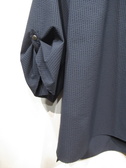細かいギンガムチェック生地 袖は6分丈ほど袖筒広め 袖口ボタンで上げてますが留めなくても良い 裾は前後差脇スリット 手洗い可能