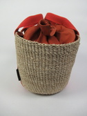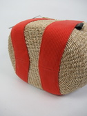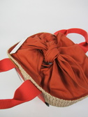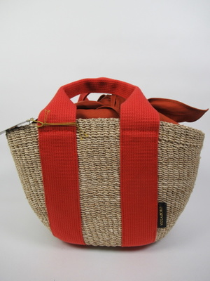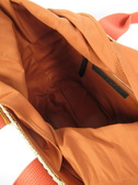 巾着型 巾着の布はオレンジ色 持ち手からつながるテープはグログラン アパカ天然素材 内側の内ポケットは牛革
