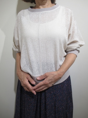 伸縮性のある生地(メッシュのように隙間がある)身頃から直接袖のドルマンデザイン(八分丈ほど)襟ぐり 袖口 裾は異素材リブ 裾は前上がり 手洗い可能