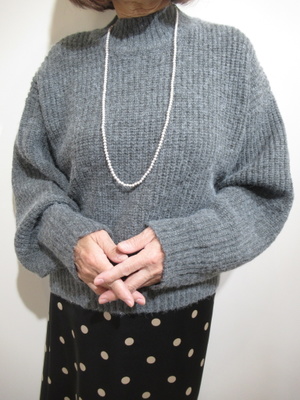 ドルマン袖つけで袖幅広め 裾は短丈 畦編みニット 袖内側から脇は編地違い 裾と襟ぐり 袖口リブ編み 手洗い可能