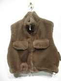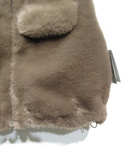 フェイクファーのベスト、シルバーのファスナー、胸元にフラップ付きだましポケット、裾は両サイド絞り付き、裏地あり