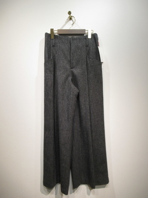 ウールツイードの生地 フロントファスナー ワンタック入りでソフトワイドシルエット ウエスト後ろギャザーゴム 裏地あり ポケットあり 手洗い可能