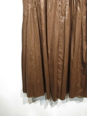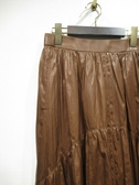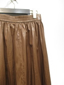 ポリエステルにロウ引きのようなコーティングがされたツヤ感ある生地 ギャザースカート 中央に切替あり(フロントは上の方から後ろ身頃の方にかけて緩やかに下がって切替え) 裏地あり 横ファスナー 脇ポケットあり ウエスト後ろギャザーゴム 手洗い可能