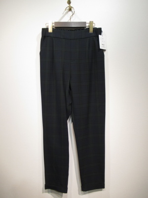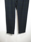 グリーンとネイビーのチェック柄、裏起毛のテーラードパンツ、裾は折り返し、裏無し、脇ポケット、ウェスト内側に紐ありで後ろゴム、手洗い可能、ID:118470と同じ形