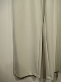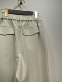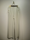 ウェスト後ろゴムのソフトワイドパンツ、脇ポケット、飾りボタンあり、裏地無し、手洗い可
