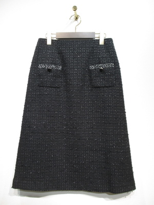 台形スカート、ひざ下丈、生地にシルバー糸を織り交ぜたツイード、裏地あり、後ろファスナー