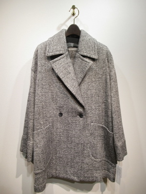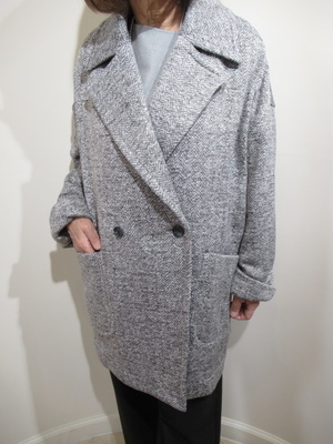 ニットソー素材(柄はヘリンボーン)、ドロップショルダー、ビッグシルエット、テーラードのフロントダブル、裏地なし、手洗い可能