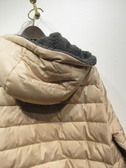 薄手のダウンジャケットコート、フード襟取り外し可能、フードの内側グレーのボア
