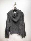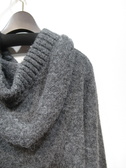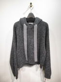 フード襟の周囲に幅広のニットのリボンを通してます