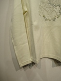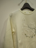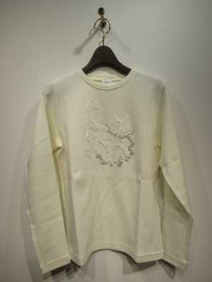 クルーネック 長袖 細かいテレコ素材 白のスパンコールで猫のデザイン画刺繍はシルバー 手洗い可能