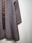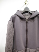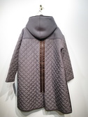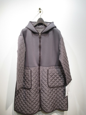 キルティングとソフトダンボール素材のドッキング ロング丈 後ろのファスナーの飾り(開けると幅が広がります) フード襟