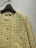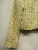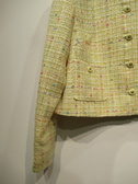 ※春物新作 春らしいイエローを基本ベースにしたミックスツイード ところどころカラフルな糸をポイントにしてます デザインはベーシックなノーカラーのジャケット 飾りボタンもイエローベース 総裏付き