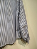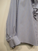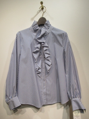 ※春物新作 ストライプ柄のシャツブラウス、前立てから襟ぐりフリル仕様、フロントは比翼、第一ボタンと袖口のカフスはシルバーボタン、手洗い可能