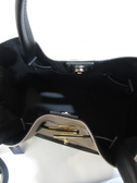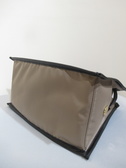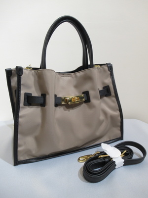ナイロン生地、持ち手とトリミング・ベルトは牛革(牛床革)、金具はゴールド、マグネット留め、内ポケットあり、ショルダーベルト付き