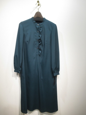 細かい小紋柄のワンピース、フロント前立てフリル使い(前立てにボタン4つあり)、袖はギャザー袖でカフスあり ペチコート付き