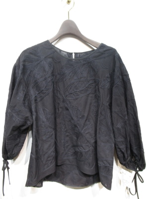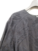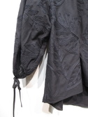 大きなボタニカル柄の刺繍(白は黒・黒は同色の刺繍糸)、ドロップショルダー、袖筒やや太め、袖筒玉縁の縁取りでギャザー、玉縁部分がリボン使い、前後差あり