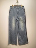 ソフトワイドデニム、ストレッチ入り、フロント面にパール飾り、中央ブリーチ仕上げ、脇ラインとポケット淵は濃いめのネイビー、手洗い可能