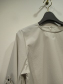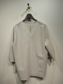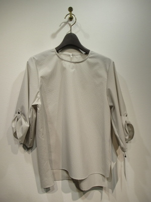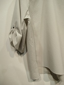 細かいギンガムチェック生地 袖は6分丈ほど袖筒広め 袖口ボタンで上げてますが留めなくても良い 裾は前後差脇スリット 手洗い可能