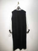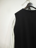 サックワンピース、身頃は綿のカットソー地、袖の白い部分は異素材のポリエステル、袖山に2本黒のピンタック入り、袖口も綿の黒のカフス、後ろファスナー、脇ポケットあり、裏地なし、手洗い可能