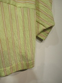 襟無しドルマン袖のシャツ、前開き(比翼)、第一ボタンはシルバー、前後差あり、コクーンタイプ、手洗い可能、ベージュ系の柄