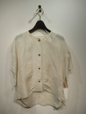 襟無しコクーン型、シャツの羽織、袖はドロップした袖付で肘が隠れるほどの長さ、後ろ下がり、手洗い可能、アームが広めなのでインナーは必須です