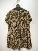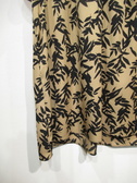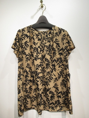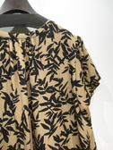 濃いベージュ系の地に黒で植物の柄 スキッパー襟 襟ぐりギャザー 前後差有り パンツセットできます