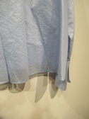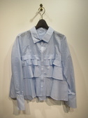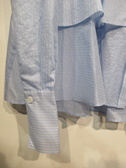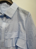 ストライプ生地 中央に切り替え フロントは3段ティアード 後ろは切り替えとタック入り 袖口広めで折り返しできる 手洗い可能