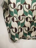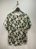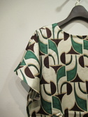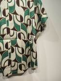 艶のあるレーヨン素材 幾何学模様 襟ぐり横に広め 身幅やや広めでそのままフレンチ袖 裾は後ろ下がり 手洗い可能