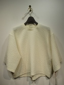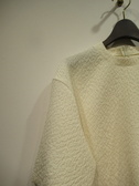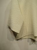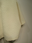 凹凸のある生地(やや光沢あり)、ドロップショルダー、六分袖、袖筒広め、後ろファスナー、手洗い可能