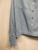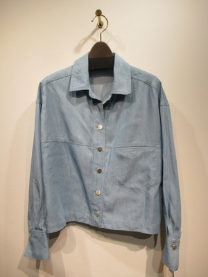 ステンカラーシャツ シルバーのボタン (袖カフスも) 左胸ポケット 身頃の中央で切り替えあり 手洗い可能
