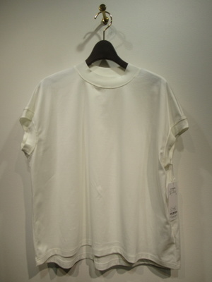 フレンチスリーブ、身幅広め、手洗い可能、ハイネック、袖口・襟ぐりリブ編み、裾前後差あり