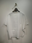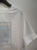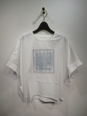 手洗い可能、フロントにスクエアのロゴ入りカットソー、プリントロゴの上にオーガンジーの生地を貼り付けている(ポリエステル素材)、白はライトグレー×ブルー・チャコールはオフホワイト×ピンクベージュ、半袖ドルマンスリーブ