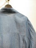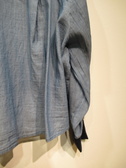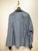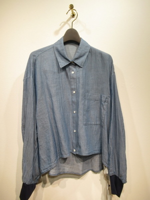 ダンガリー素材のシャツ ドロップショルダーで身幅広め 袖口ネイビーのカットソー地 前上がりの裾 手洗い可能