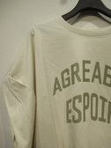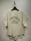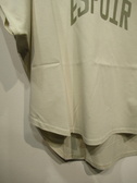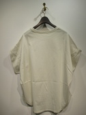 オフホワイトベースに優しいカーキのロゴ入りカットソー、身幅広め、前後差り、裾ラウンド、お袖はタックで立体感を出したデザイン、手洗い可能