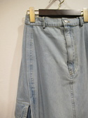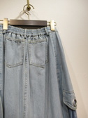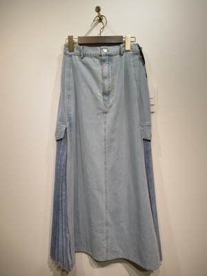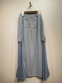 薄手のデニム生地のスカート、前ファスナー、ウェスト後ろゴム、両サイド切り替え(切り替えの中央より同色異素材のプリーツ仕様)、後ろポケット