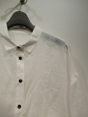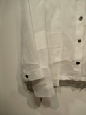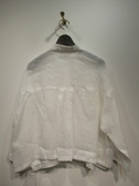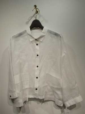 身幅幅広の7分袖のシャツ 後ろ中心にタック入り フロントに大きな貼りポケット ポケットの裾が身頃よりわざと長めに・・裾シルエットがイレギュラーになってます 手洗い可能