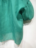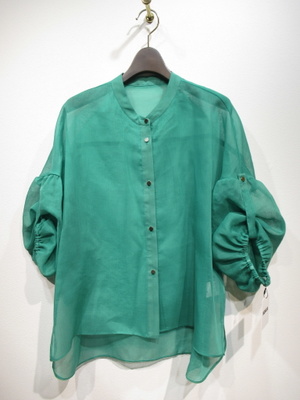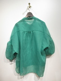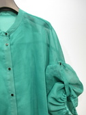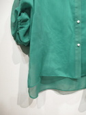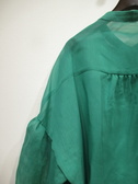 透け感のある生地、身幅広め、ドロップショルダー(切り替えの部分からギャザーでボリューム袖)、袖口ゴム入り+同色ベルトあり(ボタンは金ボタン)、裾前後差あり、背中ギャザー、手洗い可能