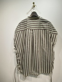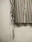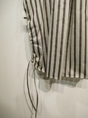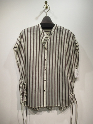 スキッパー襟の前開きブラウス、フレンチスリーブ、後ろ身頃タック入り、脇裾紐調整(絞りができるデザイン)、ボタンはゴールド、手洗い可能
