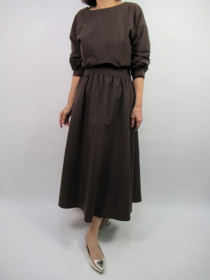 茶系が流行りの今年。少し丈長のお洒落なワンピースはウエストギャザーの甘口です。袖のカフスにコールドのバックルがポイントですね!フェミニン度70%、エレガンス度30%。