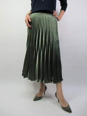 プリーツの幅が上から順に広くなって裾の方に広がりを持たせたスカートはやや光沢のあるカーキ。ネイビーのニットでコンパクトにまとめました!エレガンス度70%、スタイリッシュ度30%。